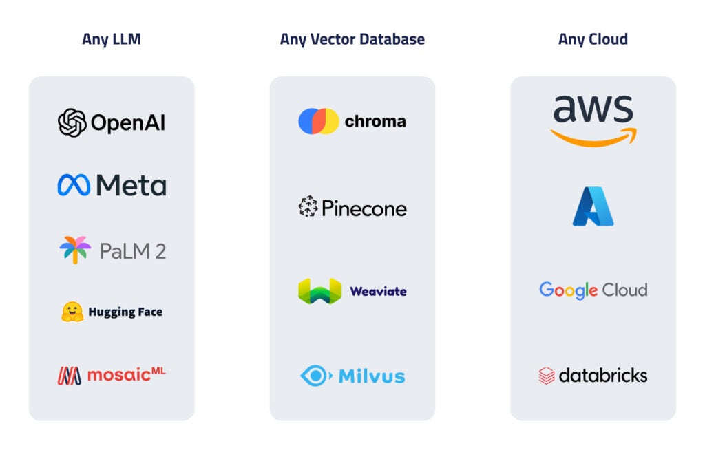 クラウド環境全体で、最適なコンポーネント(LLM、ベクターデータベース、埋め込みモデルなど)を自由に採り入れ、イノベーションを迅速に進めることができます。