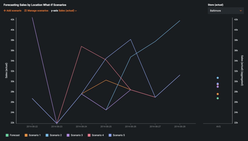 With No-Code AI Apps, you can extend the power of AI to front line business users. Now, DataRobot empowers users with increased flexibility and customization for AI-enabled time series and what-if scenario capabilities within No-Code AI Apps. With increased accuracy and efficiency for driving forward business decisions, new flexibility and customization gives users a new ability to create scenarios, save scenarios, and view selected scenarios on one chart. Easily simulate and explore scenarios to see how changing feature variables like employee staffing levels, open store hours, or fuel prices can vary business outcomes.