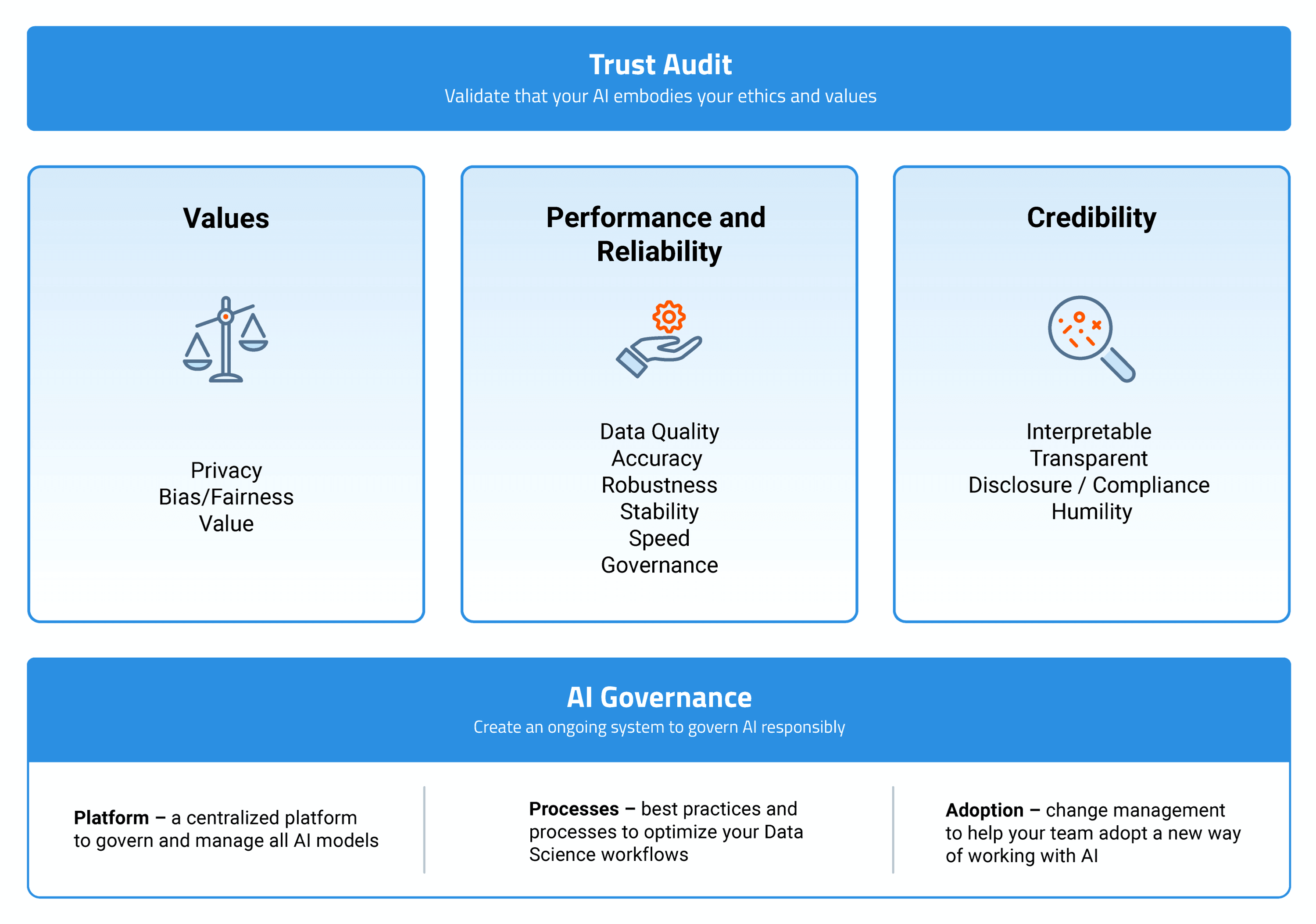 With DataRobot, evaluate AI through a trust assessment framework or establish a robust AI governance system.